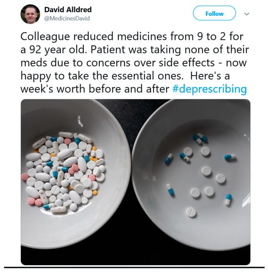 This challenge is not just evident in literature, but also on social media; a picture tweeted (Figure 1) following a medication review with a 92-year-old patient concerned about the side effects of their medications generated 270,000 impressions and 1100 retweets across the world [4]. This tweet provides a visual impression of the change in the pill burden and the high level of inappropriate polypharmacy for this patient. This sparked conversation in the clinical community not for its extreme nature, but because this is the reality for many patients seen today.