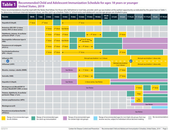 - Recommended Child and Adolescent Immunization Schedule for Ages 18 Years or Younger. 2019. Available online: https://www.cdc.gov/vaccines/schedules/downloads/child/0-18yrs-child-combined-schedule.pdf (accessed on 26 September 2019).