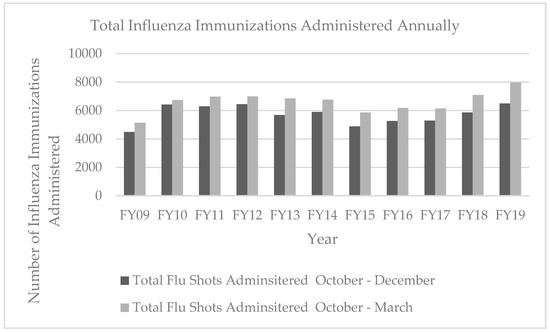 The number of influenza immunizations administered during each fiscal year at WRSU, reported from October to March and October to December, is shown in Figure 2. During fiscal year 2019 (FY2019), WRSU administered 7971 flu shots, 885 more flu shots than were given during any of the previous 10 fiscal years.