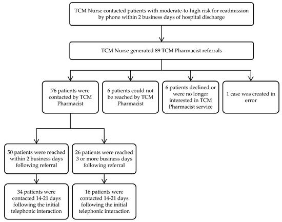 Eighty-nine TCM Pharmacist referrals were obtained from September 2018 through February 2019. Seventy-six patients were contacted by the TCM Pharmacist, six patients were not reached, six patients declined or were no longer interested, and one case was created in error, as depicted in Figure 2.
