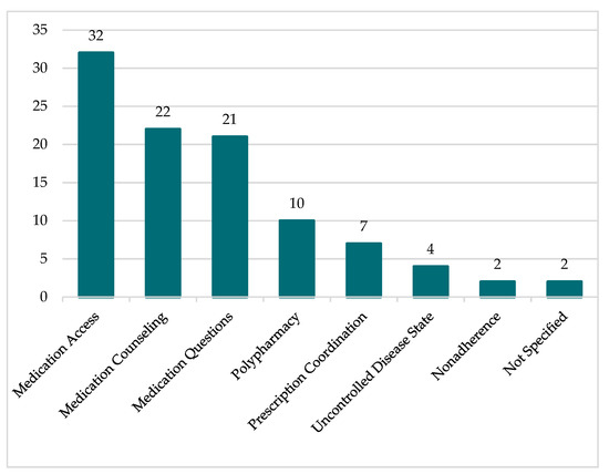 The most common reasons for TCM Pharmacist referral were medication access, medication counseling, and medication questions, followed by polypharmacy, prescription coordination, uncontrolled disease state, and nonadherence. Two cases did not include a reason for TCM Pharmacist referral. Eleven referrals included multiple reasons for referral. The specific frequency of each referral type is depicted in Figure 3.