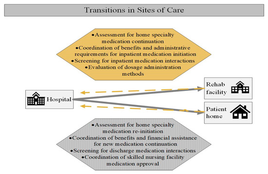 Integrated specialty pharmacists play a critical role in coordinating specialty medication management during transitions between care sites (Figure 1). Because pharmacists understand potential risks of missing doses of specialty medication therapies, they can advocate for the patient and serve as a liaison between the inpatient clinical care team and the hospital administration. While the hospital team treats the acute needs of admitted patients, an integrated specialty pharmacist coordinates care to ensure ongoing access and preventing clinically relevant lapses in therapy. Effective care coordination is accomplished through frequent communication between the inpatient and outpatient healthcare teams, often through the medical record. Electronic medical records (EMRs) are a powerful tool to coordinate the various needs of a single patient throughout many care environments [29]. Documentation can include, but is not limited to, prior authorization approval information, patient’s last medication fill date, plan for accessing the medication post-discharge, and counseling provided for new medication starts. When this important information is in the patient EMR, the entire healthcare team is aware of the plan for the specialty medication therapy.