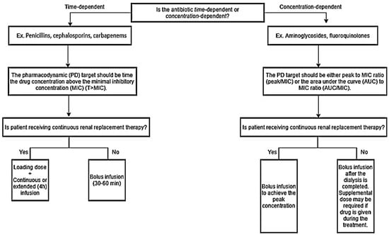 Continuous renal replacement therapy (CRRT) is commonly used in critically ill patients with acute kidney injury (AKI) due to life-threatening fluid overload and/or electrolyte abnormalities. Mortality rate from septic shock is still high (60%), despite the advancement in medicine []. The 2016 Sepsis Surviving Guideline suggests clinicians to administer the appropriate dose of antibiotic as soon as the septic shock is recognized []. Many drugs used in critically ill patients with AKI can be titrated to effect (pain medications, sedatives, and vasopressors). However, the serum concentrations of most antibiotics cannot be measured or titrated in the clinical setting. Consequently, the empiric dosing regimen must be correct with the first dose. This paper will focus on antibiotic agents and how to optimize antibiotic dosing strategies (time- vs. concentration-dependent) depending on their pharmacodynamics (PD) targets.