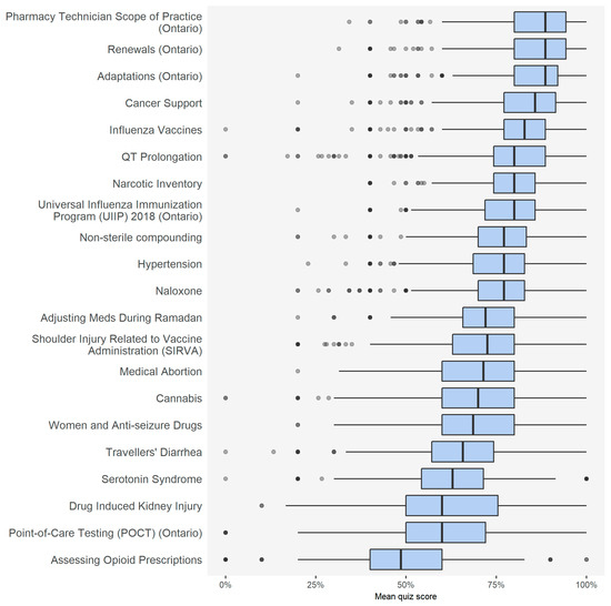 The top three modules for user performance were all related to scope of practice (Figure 3). The bottom three modules for performance were all clinical topics. For engagement, the top three modules with the highest completion rate were related to scope of practice, while the modules with the lowest completion rate related to specialty topics (Table 5, Appendix A, Table A1). After adjusting for demographic factors, both user performance and engagement were higher for users who completed more quizzes in 18 of the 21 modules, with the exception of the modules related to Ramadan, cannabis, and non-sterile compounding.