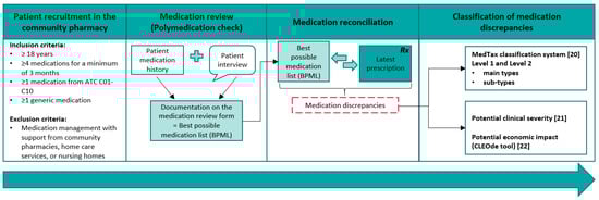 - Almanasreh, E.; Moles, R.; Chen, T.F. The medication reconciliation process and classification of discrepancies: A systematic review. Br. J. Clin. Pharmacol. 2016, 82, 645–658. [Google Scholar] [CrossRef] [PubMed]