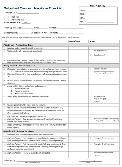 In September 2013, our health care system coordinated a systematic broad-scale quality improvement initiative to align all care transitions interventions at our institution. This quality improvement initiative resulted in the development of inpatient and outpatient interdisciplinary processes of care checklists for patients at high or moderate risk for readmission based upon institutional definitions. For the outpatient checklist (Figure 2), clinical pharmacists from the IMC and FMC were asked to serve as care transition champions along with physicians, care managers, and nurses in the development of the process of care checklist. Core elements of the interdisciplinary outpatient clinic-based care transitions program have been endorsed across the entire institution as a standard of care, and the process implementation has begun in outpatient specialty practices, including cardiology and geriatrics. These were locations that already had pharmacists in place who are now also involved in transitions of care visits. Additionally, the IMC and FMC clinical pharmacists have contributed to the development of standardized processes of care for the inpatient checklist, including provisions for: (1) handoffs between inpatient and outpatient pharmacists, physicians, and care managers; (2) hospital follow-up clinic appointment scheduling prior to hospital discharge; and (3) the coordination of post-discharge phone calls to patients to avoid duplication of services.