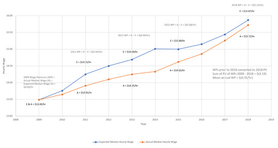 Beginning with 1997, the actual median pharmacy technician hourly wage was multiplied by the percentage change in CPI over the next year to determine the expected median pharmacy technician hourly wage for the following year. This expected median hourly wage was then multiplied by the CPI for each subsequent year to determine the median hourly wage that would have been expected for each year from the base year through May 2018. The actual median pharmacy technician hourly wage for each following year was then compared to the expected median pharmacy technician hourly wage for that year as calculated above. This is demonstrated in Figure 1, in which, beginning with the actual median pharmacy technician hourly wage in 1997, expected median hourly wages for future years were calculated, and then comparisons were made to the actual median hourly wage pharmacy technicians had each year. The primary research hypothesis is that when these comparisons are made the difference will be $0, reflecting a balance in compensation paid to these employees and their ability and willingness to accept these wages in the market. Any differences found between the actual median hourly wage and the expected median hourly wage for any particular year is defined as a wage premium (wage premium = actual median hourly wage – expected median hourly wage). Wage premiums which occurred prior to 2018 were adjusted to reflect 2018 net present values. The adjusted wage premiums were then summed from the base year through 2018, and then divided by the number of years being analyzed to determine the mean wage premium experienced by pharmacy technicians for each year over the term being considered. In the example described in Figure 1, pharmacy technicians in the United States experienced a mean adjusted wage premium of $1.99/hour between 1997 and 2018, meaning that the median hourly wage for pharmacy technicians who worked between these years was, on average, $1.99/hour higher than would had been expected had their wages increased by the CPI each year.