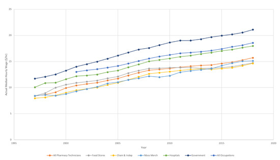 Figure 3 represents trends in the median hourly wages received by pharmacy technicians between 1997 and 2018. Median hourly wages across all pharmacy technicians have increased from $8.39/hour in 1997 (which, adjusting based on changes in the US CPI is the equivalent to $13.18/hour in 2018) to $15.72/hour in 2018. Variation in median hourly wages is noted between the settings where pharmacy technicians work. Median hourly wages for pharmacy technicians in 2018 ranged from $14.65/hour in chain and independent pharmacies and $14.73/hour in food store pharmacies to $17.97/hour in hospitals and $21.10/hour in government settings. It should also be noted that the median hourly wage in the United States in May 2018 for all workers across all occupations was $18.58/hour [24].