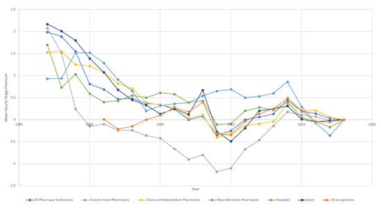 This analysis was repeated for all base years from 1997 to 2017, resulting in ranges from one year (2017 to 2018) to twenty-one years (1997 to 2018). This analysis was also performed on subsets of data for pharmacy technicians working in chain and independent pharmacies, grocery store pharmacies, mass merchandise store pharmacies, hospitals, and for government agencies. An analysis was also performed to evaluate the presence of wage premiums across all workers in all occupational groups in the United States.