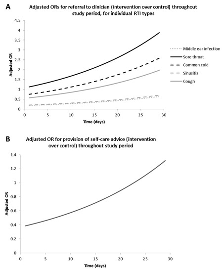 Statistical modelling demonstrated that the relationship between the intervention arm and referrals to a doctor or provision of self-care advice outcomes was complex, exhibiting an interaction with both time (date of patient consultation in the study period) and RTI type (Figure 1). The alternative model’s analysis provided evidence to suggest that the intervention was associated with a decrease in the likelihood of referral to a GP (adjusted odds ratio (aOR) = 0.91), when all factors were held constant; although this effect was greater during the early period of the study (defined as the first two of the four weeks) (Figure 1) and notable for middle ear infections (aOR = 0.18; p ≤ 0.001), sinusitis (aOR = 0.20; p ≤ 0.001) and possibly coughs (aOR = 0.54; p = 0.13), but not sore throat (aOR = 1.07; p = 0.89) or common cold (aOR = 0.72; p = 0.50). The intervention was also associated with the increased provision of self-care later in the study period, which was defined as the last two weeks (Figure 1). For consultations by non-pharmacists, there was limited evidence to suggest that patients in the intervention arm may have been referred to a pharmacist more frequently than those in the control arm (OR = 1.42; p = 0.11).