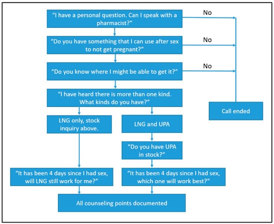 This is a prospective, telephone-based mystery caller survey. Pharmacies located in the cities of Atlanta, Georgia, and San Diego and San Francisco, California, were identified through a list of licensed retail pharmacies obtained from each respective state board of pharmacy. The lists were then filtered to include only retail pharmacies with active licenses that were open to the public. These three cities have comparable levels of urbanization according to National Center for Health Statistics Urban-Rural classification scheme, falling into the most urban categorization of “large central metro,” and were selected as a convenience sample []. Three investigators completed calls between November 2016 and July 2017. The investigators developed a structured script (Figure 1), and research students called posing as young adult females requesting to speak to a pharmacist and inquire about pregnancy prevention options after having unprotected sex. The student research callers were trained by the two primary investigators in each state, and practice calls were completed until each research student demonstrated appropriate and consistent delivery of the mystery caller script. Any questions regarding calls were triaged to the two primary investigators. The primary investigators created a standardized data collection form which was used by all the student research callers. The primary endpoints were initial EC method discussed by the pharmacist, reported EC availability, and prompted EC counseling points. Prompted EC counseling points included asking if there is more than one kind of EC product available and if EC works 4 days after unprotected sex. Unprompted pharmacist counseling points that were recorded included discussion regarding the EC window of efficacy, when unprotected intercourse occurred, age, body weight, sexually transmitted infection counseling, ongoing contraception, insurance coverage, and if the patient has a prescription for EC.