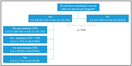 After the mystery caller patient inquired about available options for pregnancy prevention following unprotected sex, most pharmacists indicated that EC is available (CA 220, 92.1% vs. GA 121, 81.2%, p < 0.01), see Figure 2. The majority initially presented LNG alone (CA 211, 88.3% vs. GA 121, 81.2%), while a very small percentage of California pharmacists mentioned both LNG and UPA (4, 1.7%) or UPA alone (1, 0.4%). Four (1.7%) California pharmacists indicated EC was available but did not mention an EC method by name, and the remainder did not offer an EC method (CA 19, 7.9% vs. GA 28, 18.8%).