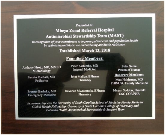 Hall JW, Bouchard J, Bookstaver PB, Haldeman MS, Kishimbo P, Mbwanji G, Mwakyula I, Mwasomola D, Seddon M, Shaffer M, et al. The Mbeya Antimicrobial Stewardship Team: Implementing Antimicrobial Stewardship at a Zonal-Level Hospital in Southern Tanzania. Pharmacy. 2020; 8(2):107. https://doi.org/10.3390/pharmacy8020107