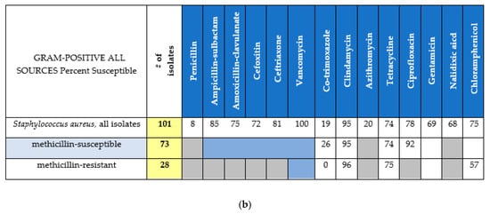 - Ramsamy, Y.; Muckart, D.J.J.; Han, K.S.S. Microbiological surveillance and antimicrobial stewardship minimise the need for ultrabroad-spectrum combination therapy for treatment of nosocomial infections in a trauma intensive care unit: An audit of an evidence-based empiric antimicrobial policy. S. Afr. Med. J. 2013, 103, 371–376. [Google Scholar] [CrossRef]