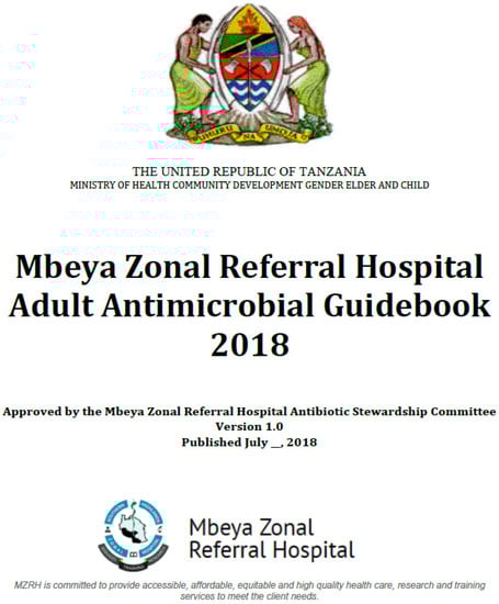 - Haldeman, M.S.; Kishimbo, P.; Seddon, M.; Sangare, A.; Mwasomola, D.; Hall, J.; Shaffer, M.; Leclair, R.; Caulder, C.; Bookstaver, P.B.; et al. Evaluation of Antimicrobial Utilization and Concordance with National Guidelines at a Tertiary Hospital in the Southern Highlands Zone of Tanzania. Am. J. Trop. Med. Hyg. 2020, 102, 370–376. [Google Scholar] [CrossRef] [PubMed]