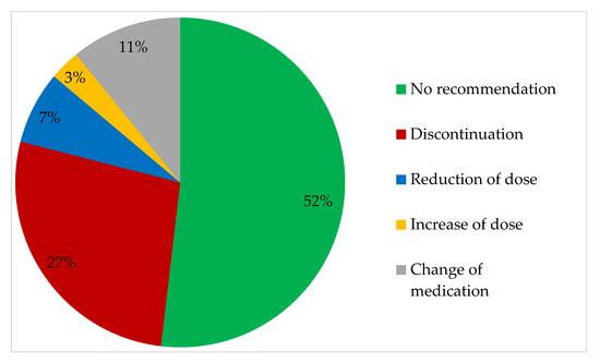 Distribution of the recommendations for the 1471 prescriptions reviewed. For 763 (52%) of the prescriptions no change was recommended.