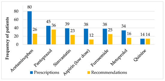The most frequently prescribed medications are set out in Figure 3. Acetaminophen was the most commonly prescribed drug (85% of patients) (also including “as needed” prescriptions). Pantoprazole was the drug most commonly recommended for changes; it was recommended that 38% of patients change their prescription for this medication.