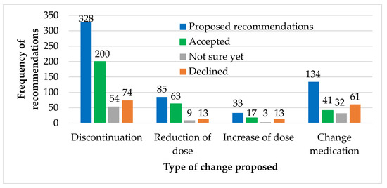 The acceptance rate of discontinuation recommendations was 61% (see Figure 4). Half (56%) of the accepted discontinuation recommendations were related to medications found in the deprescribing list [19], which is a national list of recommended drug discontinuations. GPs accepted recommendations for 263 prescriptions concerning discontinuation or reduction of dose, making up 18% of all the 1471 prescriptions reviewed. Reduction of dose and change of medication were the most and least frequently accepted recommendations (74% and 31%), respectively.