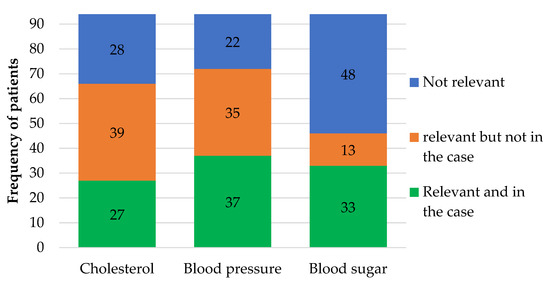 The availability of relevant laboratory data in patient cases. The figure shows the number of patient cases (n = 94) with relevant and available (green) laboratory data, relevant but missing in the patient case (orange) or cases where the laboratory data were not relevant (blue). Laboratory data were considered relevant if the patient had the diagnosis or took medication for hypercholesterolemia, hypertension and diabetes, respectively.
