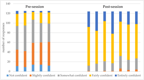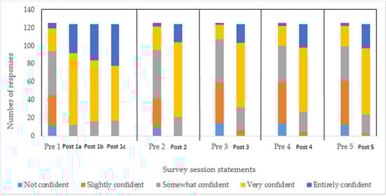 Confidence level of pharmacists for each statement in the pre-session (pre) compared to a parallel post-session statement (post). Pre-statement 1 = understanding IBD and management; post 1a = identifying signs and symptoms of IBD, post 1b = distinguishing IBD from other gastrointestinal diseases, post 1c = recognising when referral is required. Pre- and post-statement 2 = provide relevant information. Pre- and post-statement 3 = decision-making. Pre- and post-statement 4 = additional support. Pre- and post-statement 5 = address needs of patients.