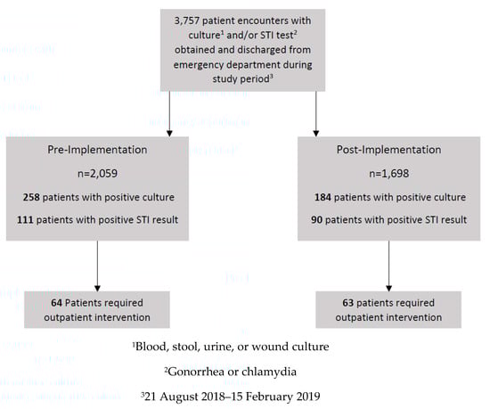 - Olson, A.; Pegelow, E.; Cowell, J.; Feldman, R.; Stanton, M.; Ray, J.; Dang, C. Pharmacist-Initiated Culture Follow-Up in the ED Reduces Time to Treatment Optimization. Ann. Emerg. Med. 2017, 70, S61. [Google Scholar] [CrossRef][Green Version]