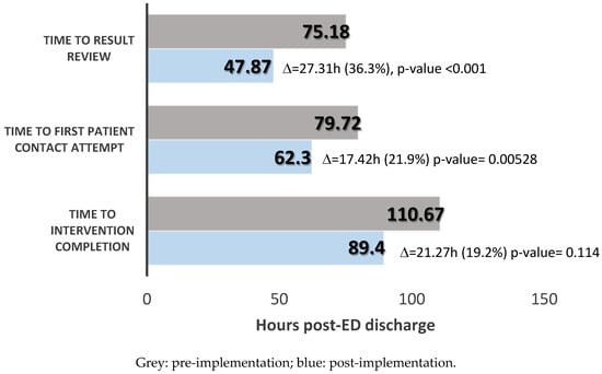 | Outcome, n (%) | Pre-implementation, n = 64 | Post-implementation, n = 63 | p-Value |