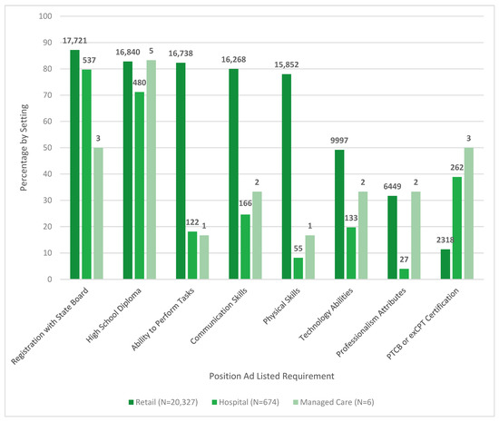 Fourteen days of data resulted in 21,007 individual position listings, with 96.78% of those being in a retail setting. These technician position listings included positions from all 50 states, Puerto Rico, and the District of Columbia. A little over one-third (37.5%) of the positions were from California, Florida, Illinois, New York, or Texas (N = 1983, 9%; N = 1889, 9%; N = 1242, 6%; N = 1188, 5.7%; and N = 1568, 7.5%, respectively). A majority of the job listings were for full-time positions (96.4%). Settings for these positions included hospital systems, retail pharmacies, and managed care companies (Figure 1).