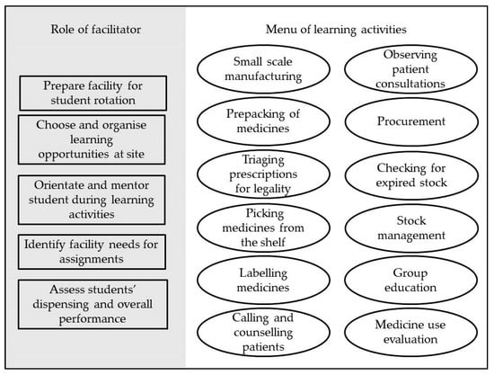 Figure 1), engage the facility staff for the students, orientate and host students, implement these learning activities during SLiP, and assess the students’ pharmacotherapeutic dispensing skills through an Objective Structured Dispensing Examination (OSDE) and overall performance at the site, which included their ability to apply theoretical knowledge, identify and address challenges, follow instructions, and interact professionally with staff and patients (