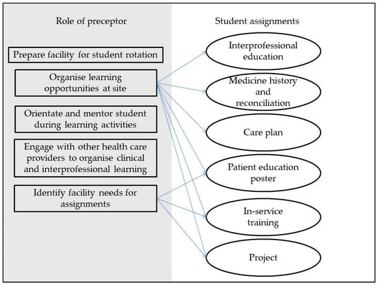 Three of the student assignments involved patient-centred activities, including the medicine history taking and reconciliation, care plan development and patient education poster. Student engagement was done either directly with the patient or indirectly via their medical records, which required the preceptor’s facilitation in (2) safe and rational use of medicines.