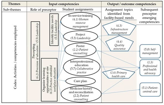 Figure 3). Input competencies correlated with the role of the preceptor in managing the facility’s preparation for students and student learning activities, orientating and facilitating students during their time at the facility, and enabling students to conduct and complete their prescribed assignments. Output/outcome competencies related to the role of the preceptor in identifying the facility’s needs relating to topics for the patient education poster, in-service training and quality improvement project assignment and those competencies that emerged as a consequence of the preceptor performing their assigned roles. As such, the input competencies represented four domains, namely (2) safe and rational use of medicines, (4) organisation and management skills, (5) professional and personal practice, (6) education, critical analysis and research, and the output/outcome competencies represented the domains of (1) public health, (4) organisation and management skills, and (5) professional and personal practice.