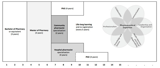 - Moreau, P.; Al-Taweel, D.; Qaddoumi, M.; Alowayesh, M. Becoming a Pharmacist: Education and Training. Encycl. Pharm. Pract. Clin. Pharm. 2019, 3B, 1–14. [Google Scholar] [CrossRef]