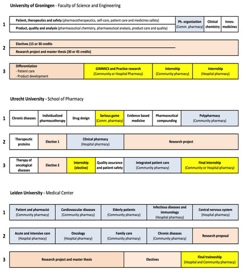 Constructing an effective competency-based educational program requires a careful design, where all elements are aligned with each other both horizontally and longitudinally [58,59,60]. Horizontal integration means that disciplinary knowledge and disciplinary-specific skills become integrated in curriculum elements (courses, etc.). It is advised that integration increases gradually and that student assignments and tasks increase in complexity as the curriculum progresses [29,59]. In the presently described curricula different ways of integrating disciplinary content can be recognized (Figure 3). The first year of the master program of the University of Groningen consists of disciplinary courses, but these courses are scheduled under two overarching themes (Patient, therapeutics and safety and Product, quality and analysis, respectively) to facilitate integration of disciplinary knowledge and skills. Another way of integrating knowledge is by organizing courses around themes (rather than disciplines), which is illustrated by courses on Innovative medicines (Groningen, year 1) and many courses in the program of Utrecht University (e.g., Chronic diseases and Quality assurance and patient safety) and Leiden University.