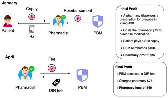 PBMs have been afforded the scope to enforce fees to commercial insurances in addition to Part D coverage. Community pharmacies are fined DIR fees under numerous different names such as network access fees, administration fees, or service fees. Oftentimes, these imposed fees are unknown to the pharmacy because there is no regulation, rule, or explanation on how and why these fees are determined. Additionally, these fees are charged retroactively which means that several months after dispensing the medication, the pharmacy is expected to make a payment the PBM demands (Figure 1) [9]. Legislation has allowed for zero oversight for any fees charged to pharmacies by PBMs [10]. This generous circumstance seems less of a coincidence when acknowledging that PBMs have paid USD 1.49 billion in lobbying during just the first three months of 2019 [11].