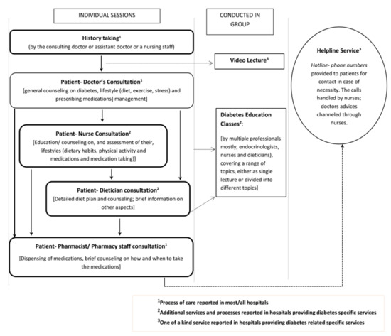 The diabetes specific services mostly included education (classes, video lectures), in-house dietician consultation and specific diabetes counselling from nurses, in addition to regular physician-patient consultations. The physicians who provided services in settings which offered diabetes classes or additional individual counselling opportunities for patients reported that they encouraged patients to attend the classes and referred patients for individual counselling with nurses or dieticians. Educational video lectures were used in one hospital, where the endocrinologist asked the patients to watch the lecture before their consultation. Similarly, a unique telephone ’Helpline System’ where patients could contact, or were contacted, to report any issues was offered by one ’care centre‘(P18, Physician). Nurses handled the telephone calls; and depending upon the nature of the reports, they offered counselling either themselves or after consultation with physicians. Endocrinologists and/or diabetologists were involved in conceptualising, supervising and facilitating these services.