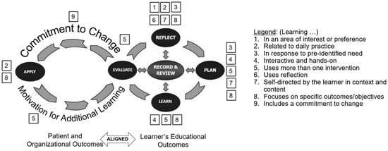 Dopp et al. reviewed the findings published in the CE and CME literature regarding effectiveness of CE and summarized them as nine key strategies that have been shown to facilitate meaningful and sustained learning, and be more likely to result in practice changes by the practitioner [37]. Their summary closely aligns with other published findings [40,41,42]. Learning had to be in an area of interest or preference (#1) and related to the daily practice of the learner (#2); learning activities had to be selected in response to a pre-identified need (#3), had to be interactive and hands-on (#4), use more than one intervention, i.e., continuing, not opportunistic (#5), use reflection (#6), be self-directed by the learner in context and content (#7), focus on specific outcomes/objectives (#8), and include a commitment to change (#9). All of these strategies are incorporated in the CPD model. Building on previously published depictions of the CPD cycle [24] based on ACPE’s version, Figure 1 emphasizes that the REFLECT stage (six strategies) and the PLAN stage (five strategies) need specific focus and attention by the learner to achieve optimal results.