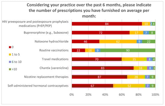 Respondents were asked if they have completed the necessary training for furnishing self-administered hormonal contraceptives, nicotine replacement therapy medications, travel health medications, routine vaccinations, and naloxone. As previously mentioned, bupropion, varenicline, and HIV PrEP/PEP trainings were included as distractor options. Though HIV PrEP/PEP furnishing authority has been approved, trainings had not been implemented at the time of the study and therefore pharmacists could not prescribe. A majority of pharmacists indicated that they had completed the trainings for routine vaccinations and naloxone, at 72% (122/169) and 65% (110/169), respectively. Although bupropion and varenicline were included as distractor options, and with HIV PrEP/PEP trainings not implemented yet, nine individuals reported that they have completed them. Figure 2 and Figure 3 depict the average number of medications prescribed in the previous 6 months and a pharmacist’s intent to prescribe in the next 6 months. Since a majority of pharmacists have completed trainings for routine vaccinations and naloxone, most were prescribing >10 routine vaccinations (66%, 90/137) and naloxone (16%, 22/139) prescriptions monthly. However, for self-administered hormonal contraceptives, 67% (6/9) of APhs were prescribing 1–10 prescriptions per month.
