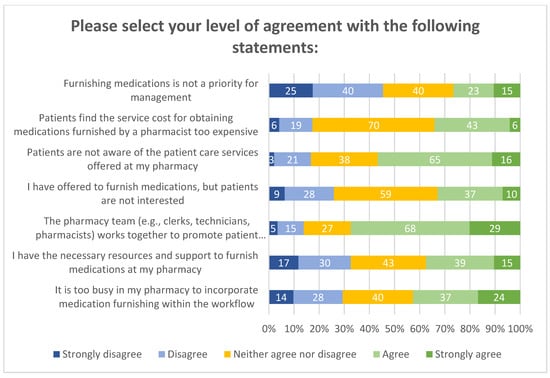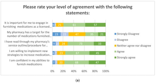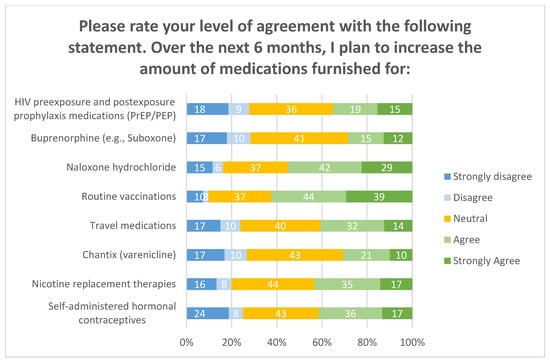 Overall, pharmacists agreed they intended to increase medication furnishing over the next 6 months, primarily for routine vaccinations and naloxone once again. Over half of respondents (77%, 115/149) were confident in their abilities to furnish medications, were willing to implement new strategies to increase medication prescribing, and have read through their pharmacy’s service outline/procedures. These items are depicted in Figure 4a,b and Figure 5. Approximately one-third of respondents reported that their pharmacies had a goal number of medications to prescribe per month (32%, 47/148).