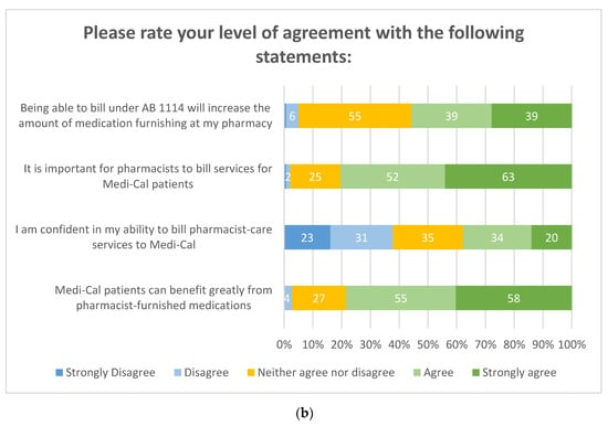Regarding services provided to state Medicaid beneficiaries, only 32% (48/149) were enrolled as ORP providers. The same number of individuals, 32% (48/149), did not know what an ORP provider was. Notably, a subgroup analysis revealed that 100% (38/38) of individuals enrolled as an ORP provider due to management requirements (38/48) worked in grocery store pharmacies. In addition, 100% (9/9) of those enrolled by their own initiative were independent community pharmacists. Twenty-three pharmacists indicated they did not intend to obtain their ORP provider status, for reasons that they are not interested at this time (36%, 8/22), management does not require it (32%, 7/22), or the process is too confusing (14%, 3/22). Overall, pharmacists agreed that Medicaid patients can benefit from pharmacist-prescribed medications, it is important to bill for their services, and the ability to receive reimbursement will increase the amount of medication prescribing. However, only 38% of pharmacists indicated they were confident in readiness to bill Medi-Cal for patient care service, and 38% indicated they were not confident, as depicted in Figure 4b.