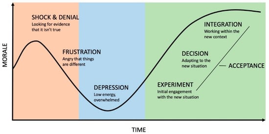 Kübler–Ross model of the emotional impact of change, based on their grief cycle [7]. Adapted from several sources.