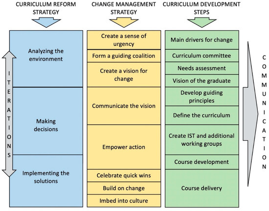 All along the way, change management has to be organized to make sure that the members of the college are gradually engaged in this global project. Managing change is managing people; leaders and managers need to have good emotional intelligence to identify the sources of change resistance and to address them diligently and effectively [40]. This is true at the individual and collective levels. Indeed, the internal culture is a powerful element that can derail great projects if it is not considered initially or inappropriately gauged. The positive side is that, if the culture is understood and respected, it can become a great ally to engage members of the college in an amazing journey that will make them proud of their new curriculum and their college’s reputation for years to come.