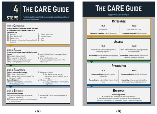 The consultation process between a community pharmacist and the consumer is the foundation of a longstanding relationship. Professionalism, approachability, empathy, and proactiveness are qualities of community pharmacists that are important in building this pharmacist–consumer relationship. Considering these attributes, the authors propose a four-step CARE (Categorize, Assess, Recommend, Empower) approach to facilitate and optimize the outcomes of community pharmacist-led nutritional supplement consultation (Figure 1A). The CARE model is similar to the widely adopted Pharmacist-Patient Care Process (PPCP) [13], which was developed by the United States Joint Commission of Pharmacy Practitioners and is now a requirement for PharmD accreditation program. PPCP was developed based on extensive evidence from pharmaceutical care and comprehensive medication therapy management, where pharmacists developed individualized patient-centered care plan in collaboration with other health care professionals and patients, family, and caregivers. The CARE model has a similar step-by-step patient-centric approach, with specific emphasis on nutrition care by pharmacists in the community setting.