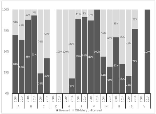 In 2014, 39.2% (892/2274) of all prescriptions were off-label and 0.4% (8/2274) were unlicensed, whereas in 2004, 34.3% (678/1978) of all prescriptions were either off-label or unlicensed (Table 1).