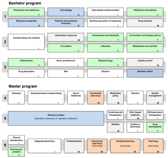 Schematic representation of the bachelor and master curriculums, years 1–6. The curriculum consists mainly of courses, where content of different disciplines is integrated (I, white color) or where relevant themes are used as organizing principles (T, green color); only a few courses in year 1 are monodisciplinary (D, blue color). Other courses emphasize methodological aspects (procedures) rather than content (M, grey color). Internships in community and hospital pharmacy (W, salmon color) are scheduled in the master program.