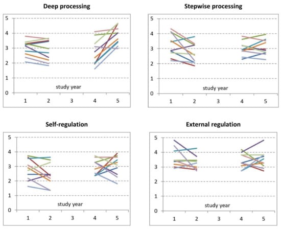 Differences between individual students in deep and surface learning. Scale scores (Y axis) for processing and regulation strategies in year 1, 2, 4 and 5 of eleven individual students are plotted in the figure. Each unique color represents the data of one-and-the-same student.