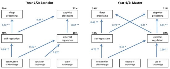 Relations between conceptions of learning, regulation strategies and processing strategies in the bachelor and master programs. Statistically significant positive path coefficients (* p < 0.05 or ** p < 0.01) are represented by the blue arrows; non-significant paths were excluded. The percentage of explained variances for each for the processing and regulation strategies is indicated on top of the relevant boxes. The fit of both path models was good (RMSEA < 0.05).