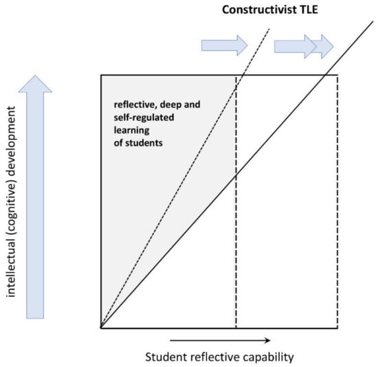 A model for stimulating cognitive development in a constructivist teaching/learning environment (TLE). The longitudinal cognitive development of students (symbolized by the left-hand arrow) is supposed to increase in a curriculum (bottom to top). In a constructivist curriculum, the cognitive development of students, expressed as reflective, deep, and self-regulated learning, is fostered by characteristics of the TLE, which can stimulate cognitive development to a small or larger extent, as symbolized by the slope of the diagonal line (one or two arrows, respectively). Whether the full potential of a curriculum is achieved also depends on the ‘reflective capability’ of the student involved.