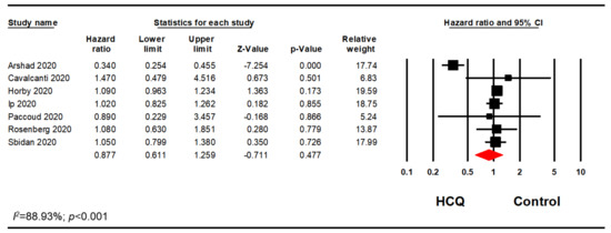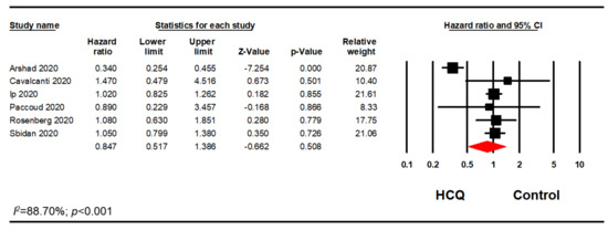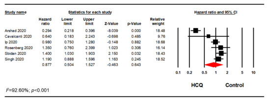 Since the studies used AZI in varying degrees, we only included studies that met our inclusion/exclusion criteria. Out of 14 studies, we excluded six studies as the AZI use was less than 80% AZI in the treatment group or greater than 20% AZI in the control group [31,34,35,37,42,43]. Another two studies were excluded as there was no information on possible association with AZI [39,41]. Therefore, a sensitivity analysis using the reported HR or relative risk on six studies was performed. This analysis included five studies that reported adjusted HR and one study that reported adjusted relative risk. Meta-analysis of these six studies confirmed our previous finding that HCQ did not significantly reduce mortality in hospitalized patients with COVID-19 (HR, 0.88; 95% CI, 0.50–1.53; p = 0.643; I2 = 92.60) (Figure 7).