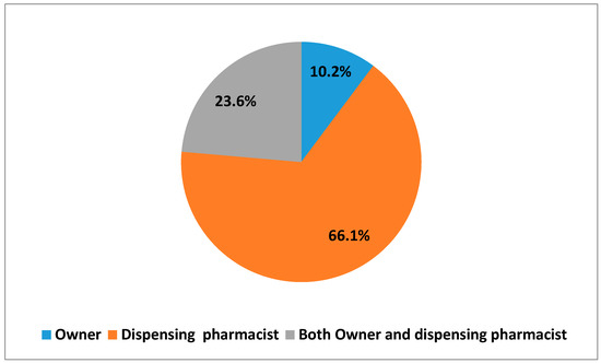 A total of 127 (64.5%) pharmacists worked in community pharmacies. Out of these respondents, who work in community pharmacies 13 (10.2%) were pharmacy owners, 84 (66.1%) were dispensing pharmacists and 30 (23.6%) were both owners and dispensing pharmacists (Figure 1). The majority, 68 (58.2%) of the respondents work in community pharmacies that are located in Dar es Salaam region and 11 (8.7%) in the Mwanza region of Tanzania (Figure 2).