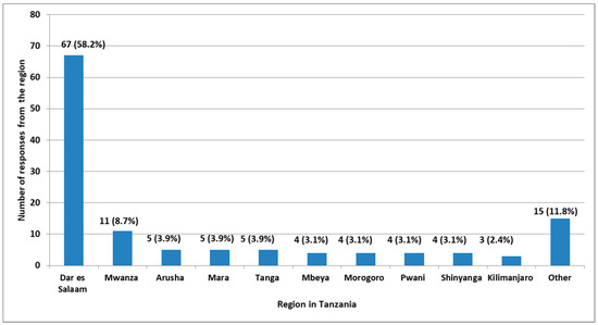 Region of the practice of community pharmacists in Tanzania (n = 127). Other regions were Lindi, Ruvuma, Singida, Tabora, Dodoma, Iringa, Kagera, Kigoma, Mtwara, Songwe, and Mjini Magharibi which each with less than three responses.