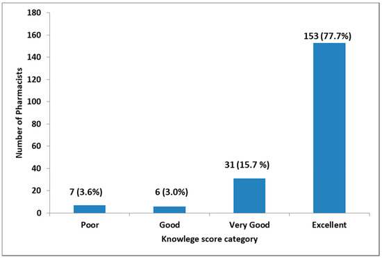 The overall pharmacist knowledge of legal needs to dispense antibiotics and AMR. The Likert scale was used to categorize pharmacists based on their scores on the ten questions to assess pharmacist knowledge (n = 197).